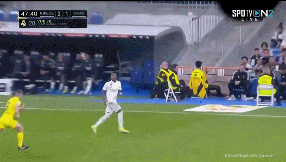 零点吧足球4月9日讯 西甲第28轮,皇马2-3被黄潜逆转。比赛第47分钟,维尼修斯上演背部停球,随后独闯龙潭杀穿黄潜防线推射破门。