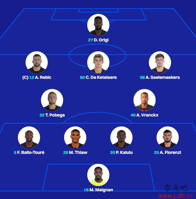 AC米兰首发:16-迈尼昂、5-巴洛-图雷、28-佳夫、20-卡卢卢、25-弗洛伦齐、32-波贝加、40-弗兰克斯、12-雷比奇、90-德凯特拉雷、56-萨勒马科尔斯、27-奥里吉