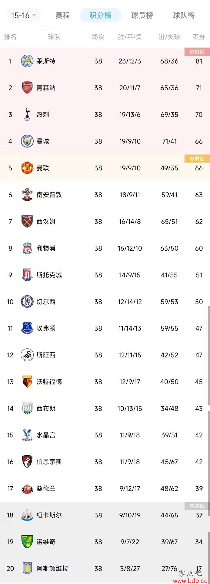【积分榜|15/16英超】莱斯特城夺冠,枪刺城前4,上下半区已变天