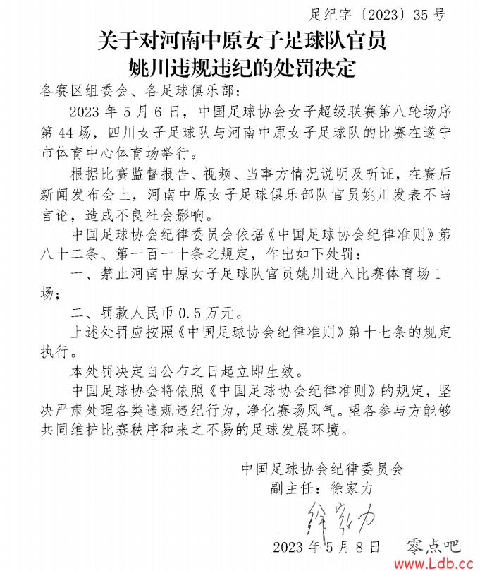 零点吧足球5月8日讯 今日,中国足协开出罚单,对5月6日女超第8轮四川女足与河南中原女足比赛赛后,河南中原女足官员姚川所发表的不当言论进行处罚。