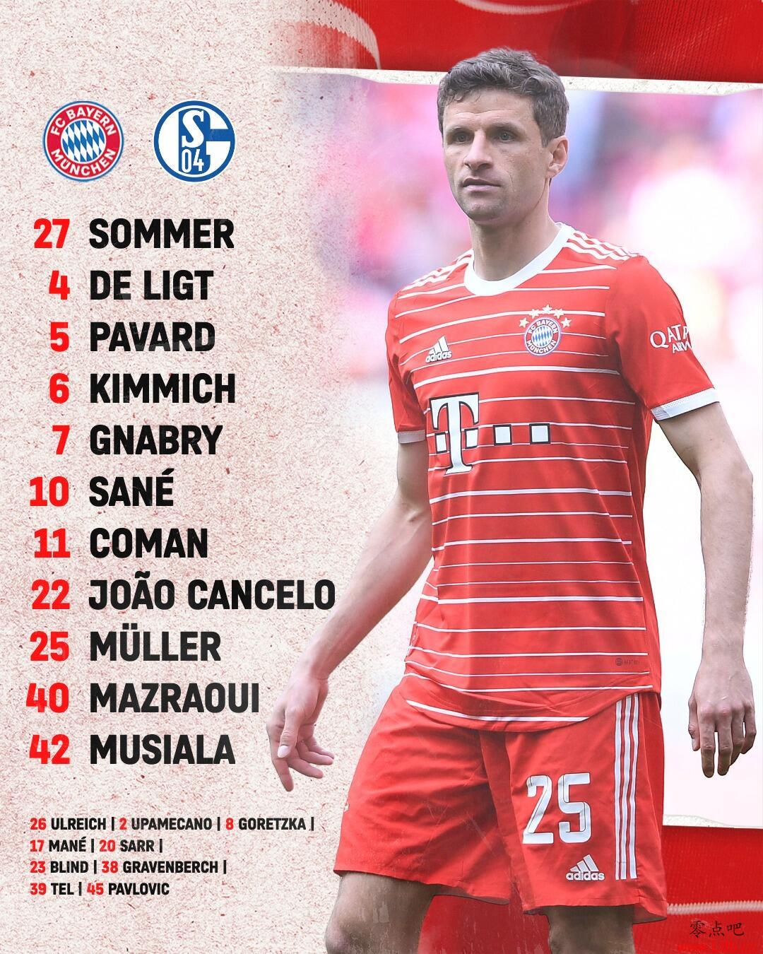 零点吧足球5月13日讯 北京时间今天21:30,德甲第32轮(倒数第3轮),拜仁慕尼黑主场迎战沙尔克04。赛前双方公布首发阵容。