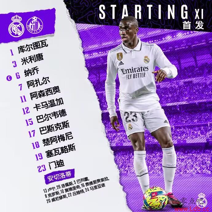 皇马首发:1-库尔图瓦、17-巴斯克斯、3-米利唐、6-纳乔、23-费兰-门迪、12-卡马文加、18-琼阿梅尼、19-塞巴略斯、15-巴尔韦德、11-阿森西奥、7-阿扎尔