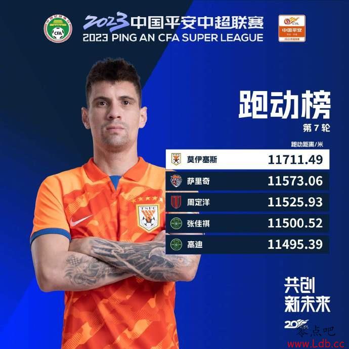 中超第7轮跑动榜:莫伊塞斯高居榜首,周定洋连续4轮进前五