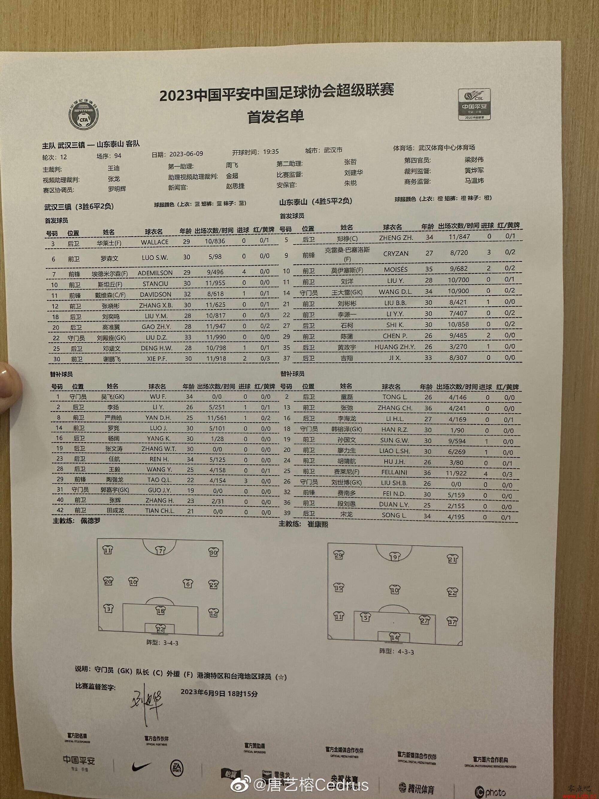 零点吧足球6月9日讯 北京时间19点35分,中超第12轮迎来一场焦点大战,武汉三镇主场对阵山东泰山。赛前双方首发公布!
