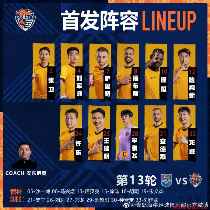 零点吧足球6月28日讯 北京时间19点35分,中超第13轮, 天津津门虎主场对阵青岛海牛,赛前双方首发公布!
