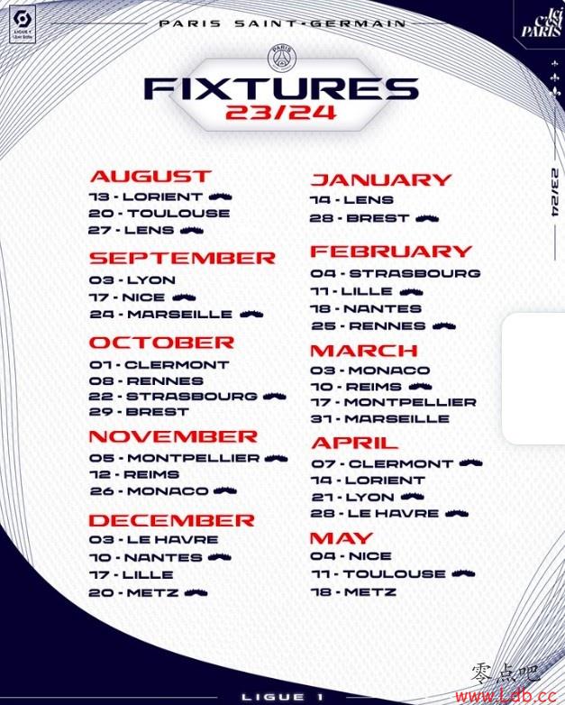 零点吧足球6月29日讯 法甲2023-23赛季的赛程已经公布,卫冕冠军巴黎圣日耳曼在梅西离队后将再次启航。根据赛程安排,巴黎圣日耳曼将于9月24日以及明年3月31日两战马赛。