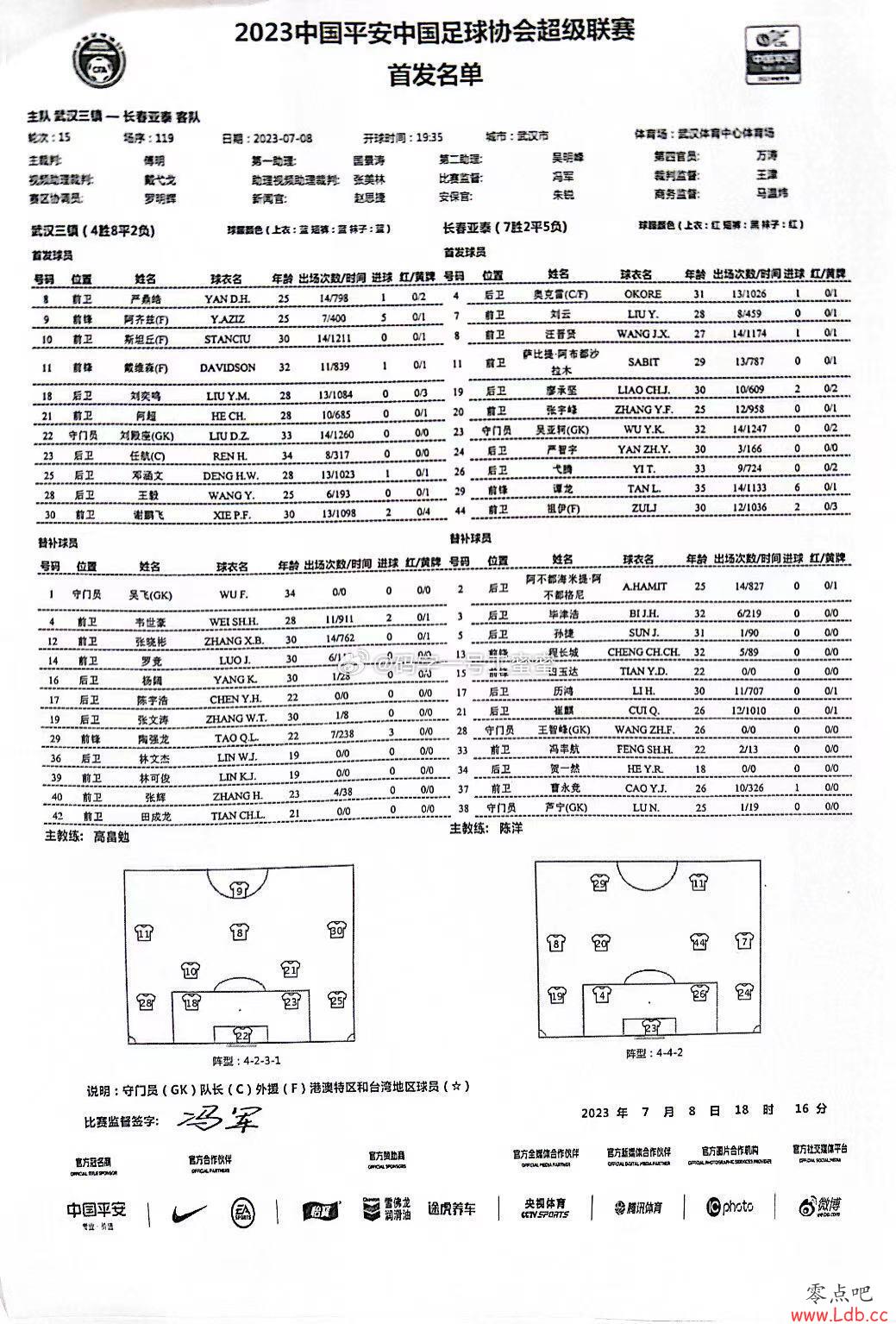 零点吧足球7月8日讯 北京时间今天19:35,中超第15轮,武汉三镇主场迎战长春亚泰。赛前首发公布首发阵容。