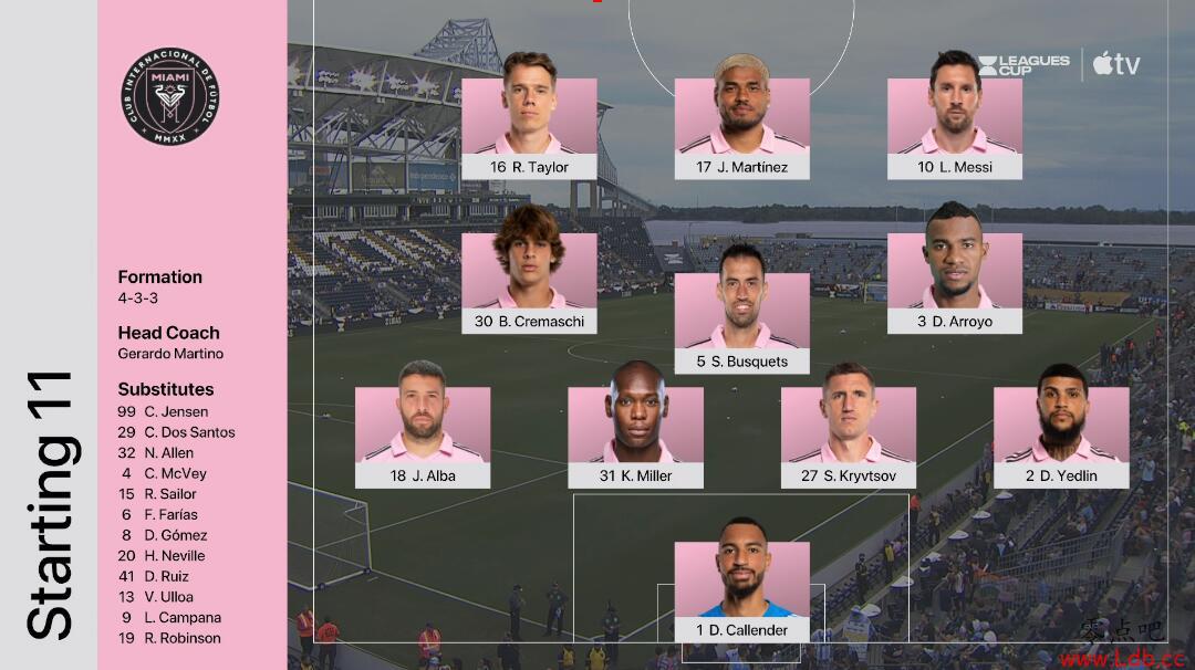 迈阿密国际首发:1-卡伦德、2-耶德林、27-克里夫索夫、31-米勒、18-阿尔巴、3-阿罗约、5-布斯克茨、30-克雷马斯基、16-泰勒、17-马丁内斯、10-梅西
