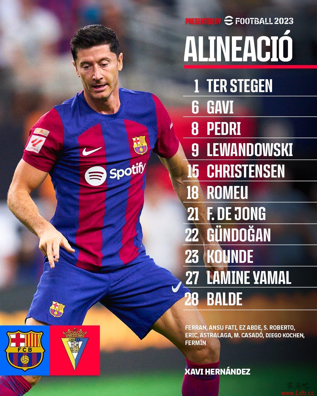 巴萨首发:1-特尔施特根、15-克里斯滕森、18-罗梅乌、23-孔德、28-巴尔德、6-加维、21-德容、22-京多安、8-佩德里、9-莱万多夫斯基、27-亚马尔