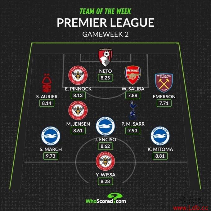 零点吧足球8月22日讯 英超第2轮联赛已经完赛,whoscored也列出了本轮最佳阵容,布莱顿、布伦特福德各3将在列。