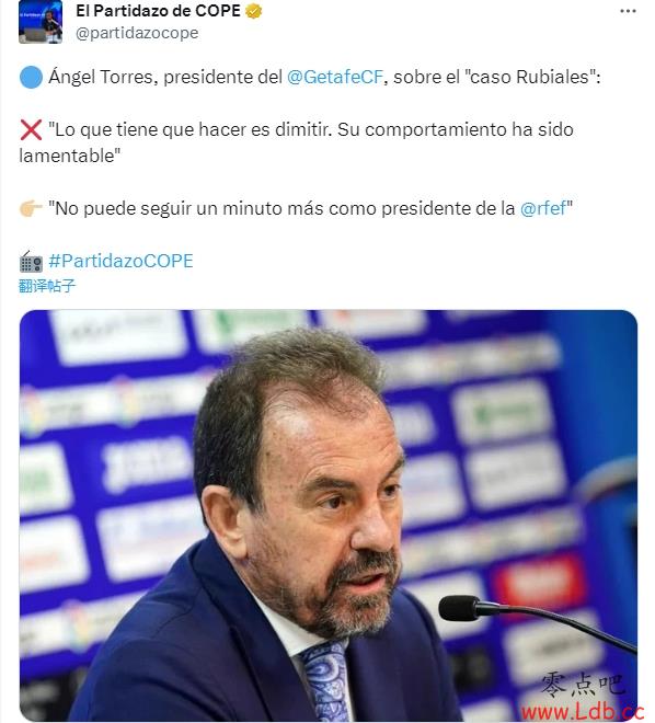 零点吧足球8月23日讯 关于西班牙足协主席鲁比亚莱斯强吻埃尔莫索的行为在继续发酵,赫塔费主席安赫尔-托雷斯呼吁让鲁比亚莱斯辞职。