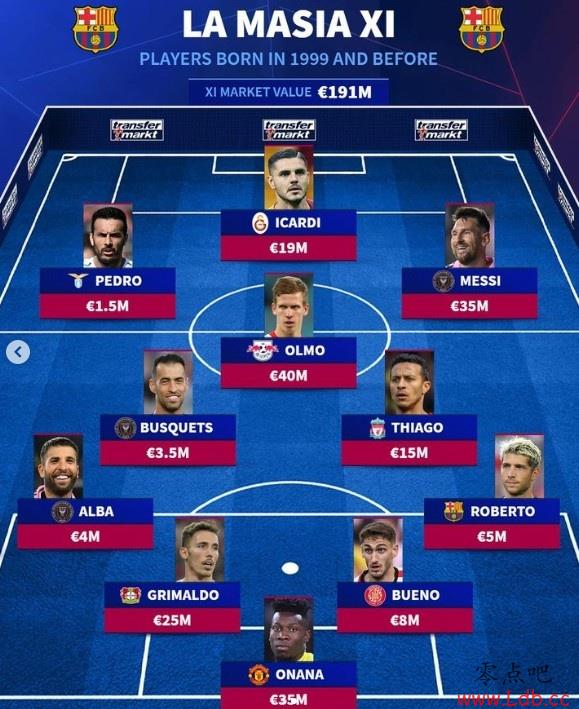零点吧足球8月24日讯 《转会市场》列出了出生于1999年及之前的巴萨青训出品现役最佳阵,梅西领衔。
