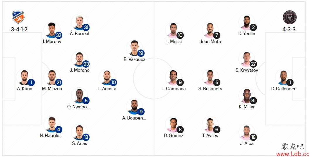 零点吧足球8月24日讯 北京时间07:00,美国公开杯半决赛,迈阿密国际对阵辛辛那提FC首发名单公布。
