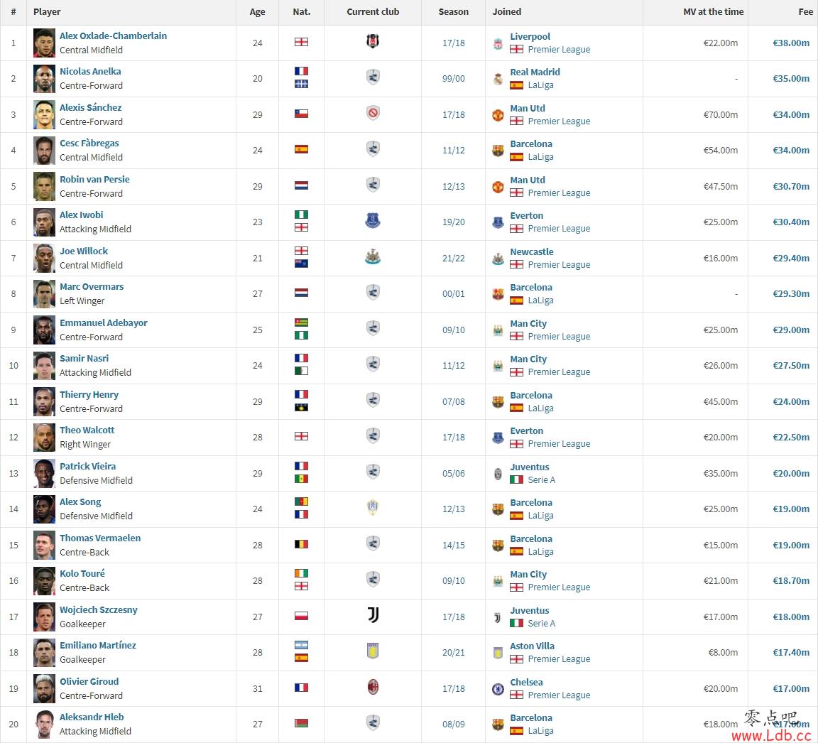 阿森纳出售球员的转会费纪录目前由张伯伦保有,他在2017年夏天以约3800万欧的转会费转投利物浦。今夏张伯伦已经自由转会贝西克塔斯。