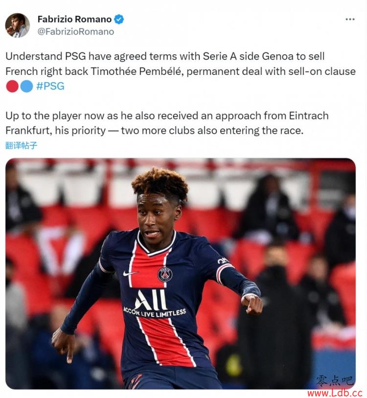 零点吧足球8月25日讯 据知名记者罗马诺的消息,热那亚与巴黎就法国右后卫彭贝莱(Timothée Pembélé)的转会达成协议,现在球员将做出决定。