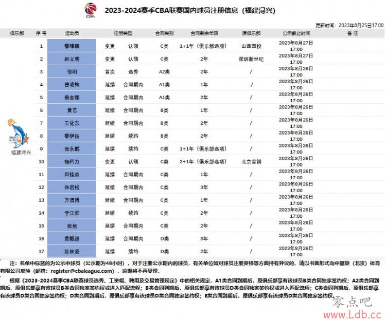 零点吧8月25日讯 CBA官网今天更新了国内球员注册信息,其中,福建男篮注册17人。