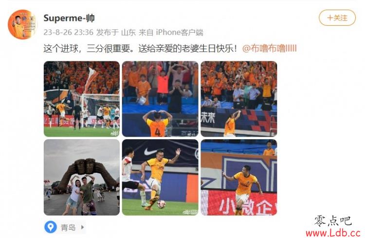零点吧足球8月27日讯 昨晚的中超,青岛海牛1-0长春亚泰,刘军帅为青岛打进制胜进球。赛后刘军帅更新社媒将进球送给妻子。