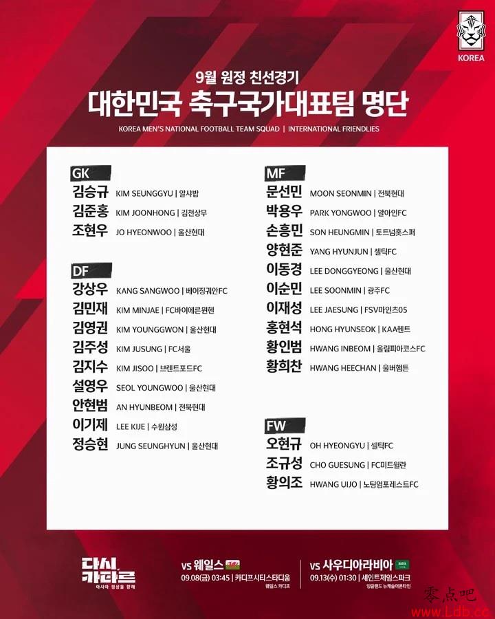 零点吧足球8月28日讯 今天,韩国足协公布了参加9月份国际友谊赛的国家队25人名单,孙兴慜、金玟哉、金英权、李在城等主力均入选名单。最近伤愈复出的李刚仁、金珍洙、宋范根等人并未进入名单。效力国安的姜祥佑,时隔1年零8个月重返国家队。9月份,韩国队将前往欧洲,分别在9月8日和13日交手威尔士、沙特。
