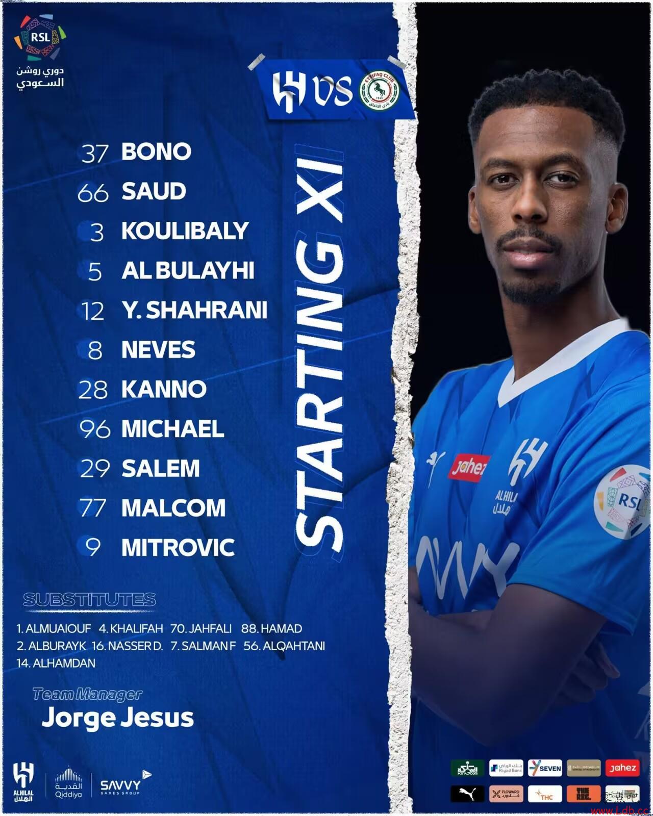 利雅得新月首发:37-布努、66-阿卜杜勒哈米德、3-库利巴利、5-布莱希、12-沙赫拉尼、8-鲁本-内维斯、28-穆罕默德-卡努、96-迈克尔、29-萨勒姆-达瓦萨里、77-马尔科姆、9-米特洛维奇