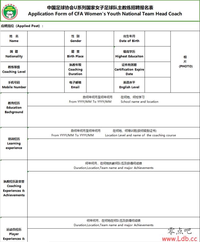 附件:中国足球协会U系列国家女子足球队主教练招聘报名表