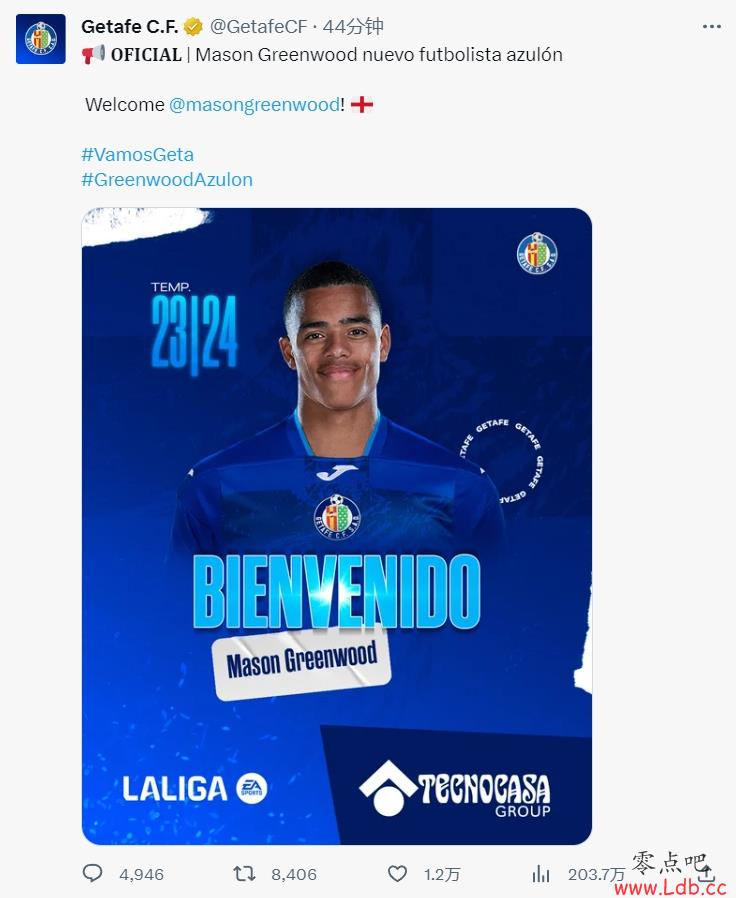 零点吧足球9月2日讯 赫塔费官方宣布,租借签下曼联前锋格林伍德。赫塔费官宣后推文下评论飞涨,不出意料恶评如潮。