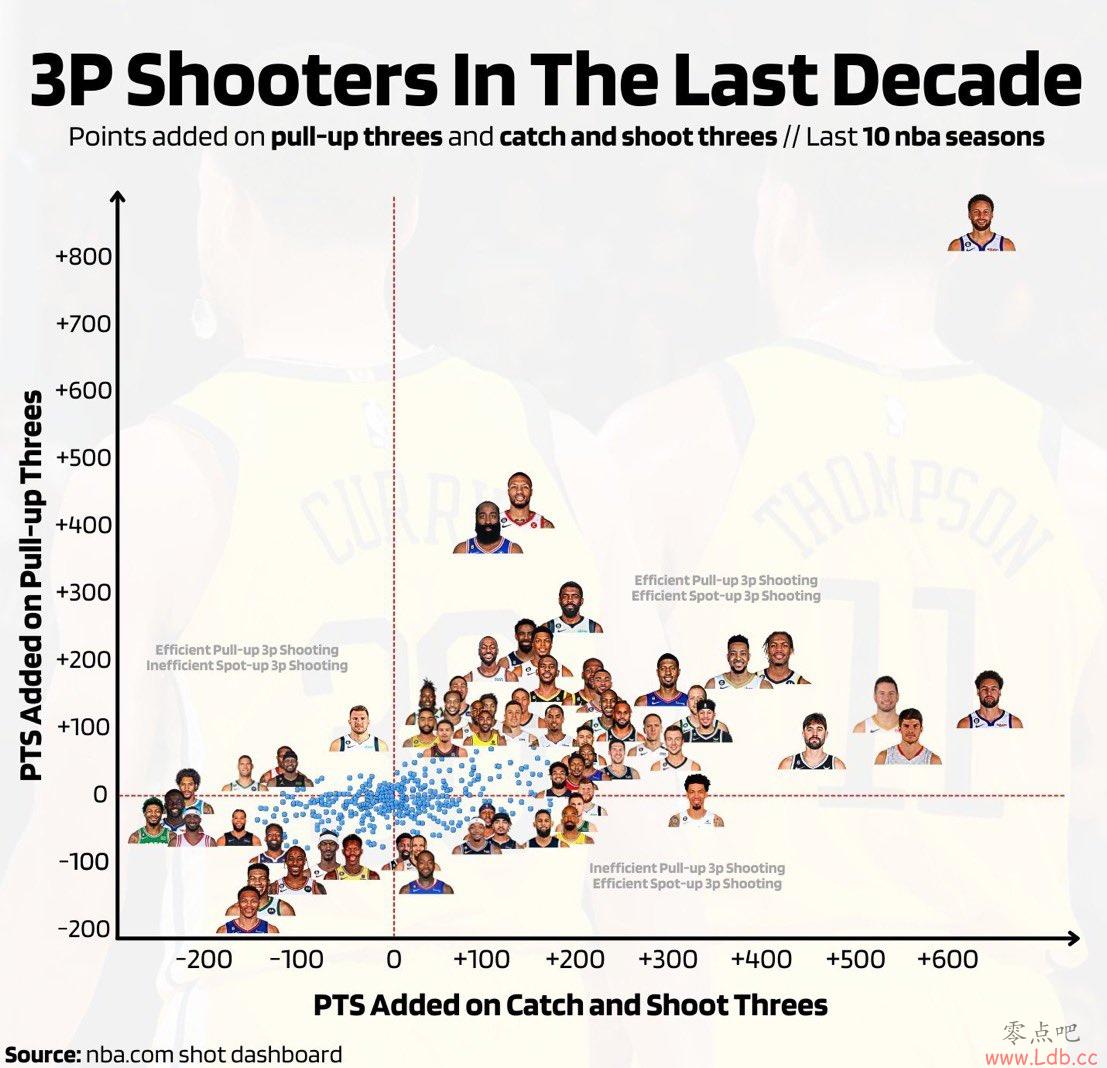 过去十年干拔&接球三分榜:库里一枝独秀 威少干拔最低效