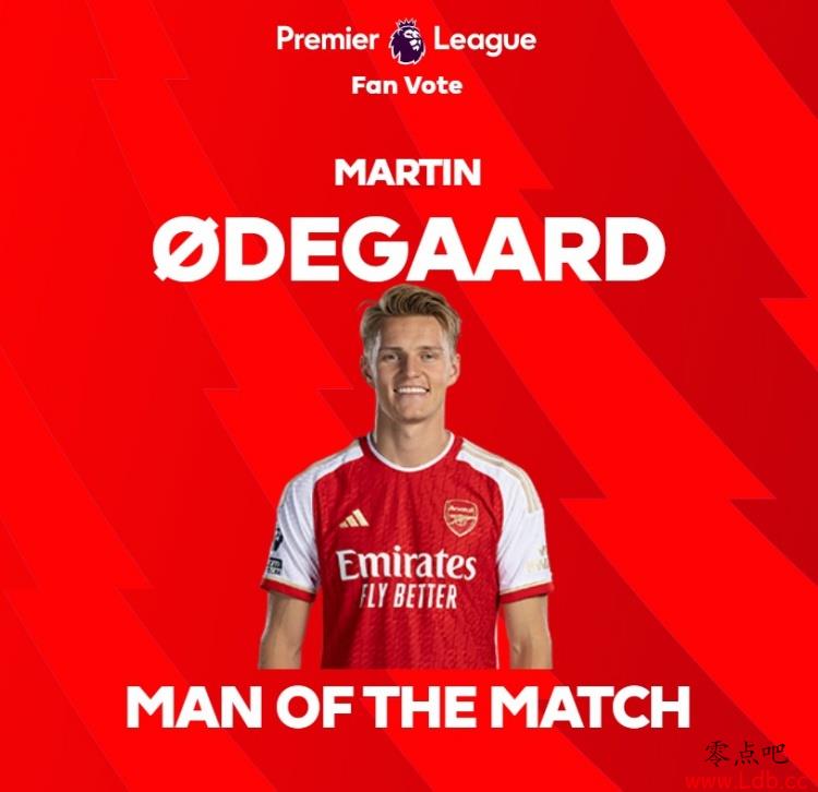 零点吧足球10月1日讯 英超官网消息,厄德高当选阿森纳4-0伯恩茅斯一战全场最佳。