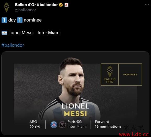 金球奖官推写道:“一天一个提名选手,梅西,迈阿密国际。”