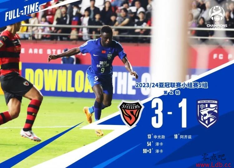 全场比赛结束,武汉三镇1-3负于浦项制铁。