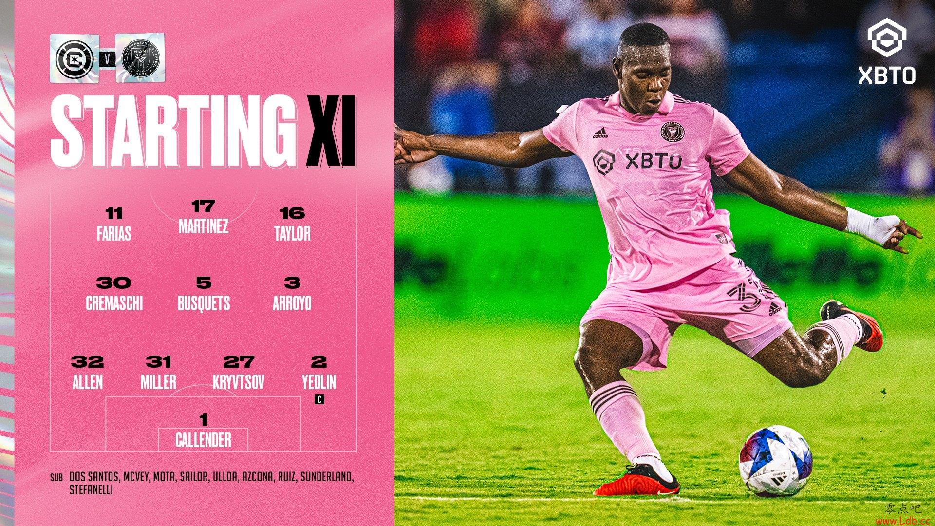 迈阿密国际首发:1-卡伦德、31-米勒、27-克里夫索夫、32-艾伦、2-耶德林、5-布斯克茨、3-阿罗约、30-克雷马斯基、16-泰勒、法里亚斯、17-马丁内斯