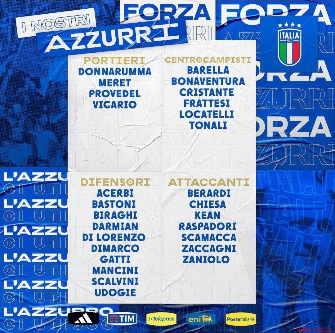 后卫:阿切尔比、巴斯托尼、比拉吉、达米安、迪洛伦佐、迪马尔科、加蒂、曼奇尼、斯卡尔维尼、乌多吉