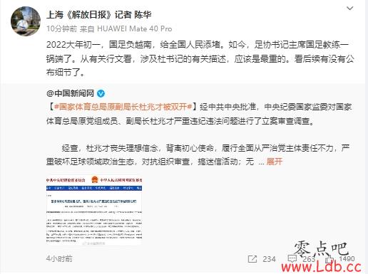 零点吧足球10月07日讯 今天,中央纪委消息,国家国家体育总局原党组成员、副局长杜兆才严重违纪违法被开除党籍和公职。
