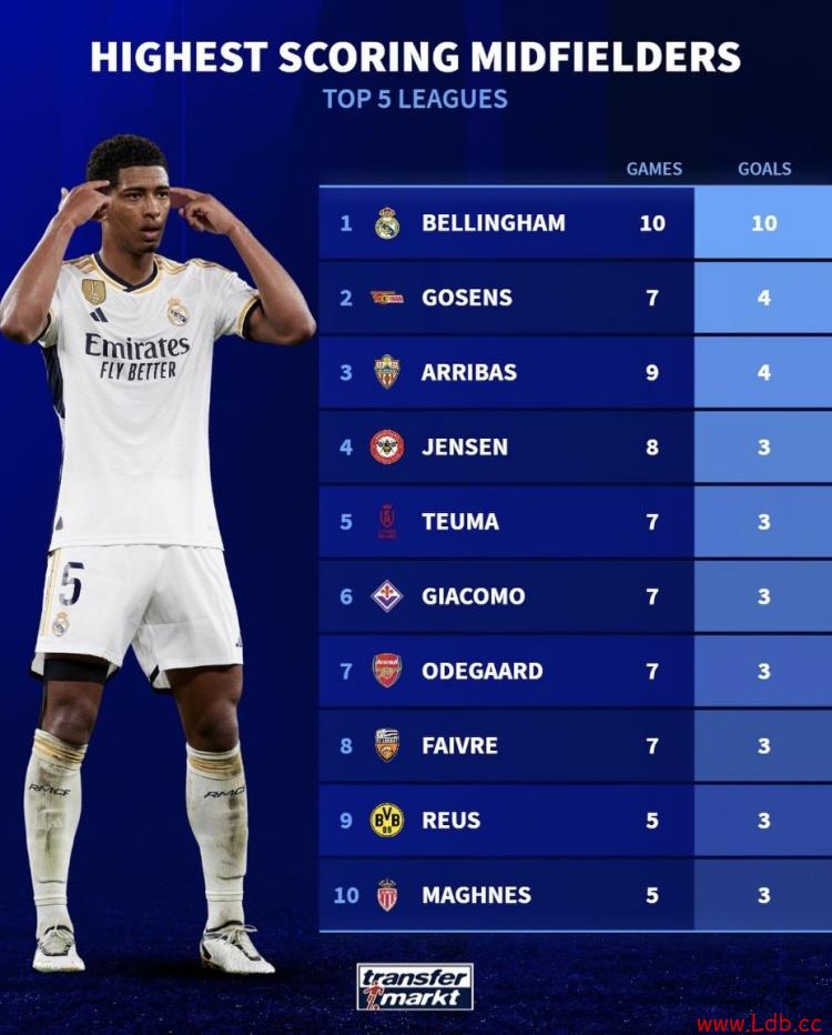 零点吧足球10月8日讯 德转统计本赛季五大联赛中场球员进球排行榜,贝林厄姆10球遥遥领先。