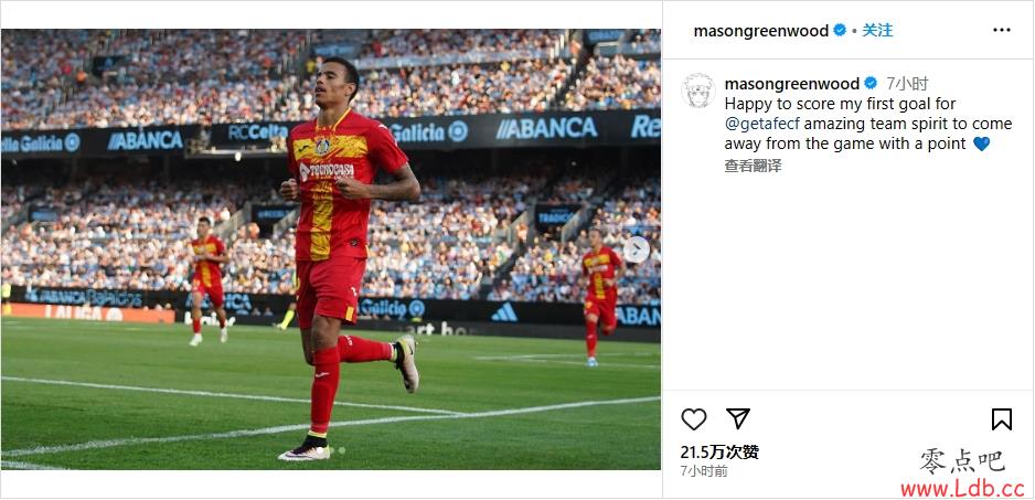 赛后格林伍德更新ins写道:很高兴为赫塔费打进我的第一粒进球,令人惊叹的团队精神让我们在比赛结束时收获1分。