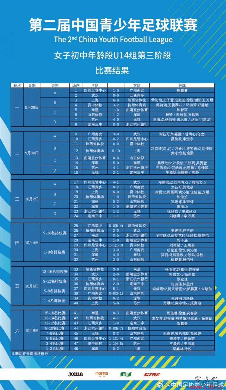10月8日,在经过了三个阶段193场比赛的激烈角逐之后,2023第二届中国青少年足球联赛(女子初中年龄段U14组)比赛全部结束,上海U14女足在决赛中凭借蔡鑫林和徐悦的两粒进球,以2-0击败深圳U14女足,获得冠军。