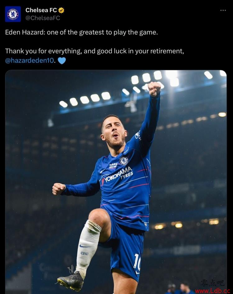 切尔西官推晒出阿扎尔身穿蓝军战袍时庆祝的照片,并写道:“埃登-阿扎尔:最佳足球运动员之一。感谢你付出的一切,祝你退役后一切顺利。”