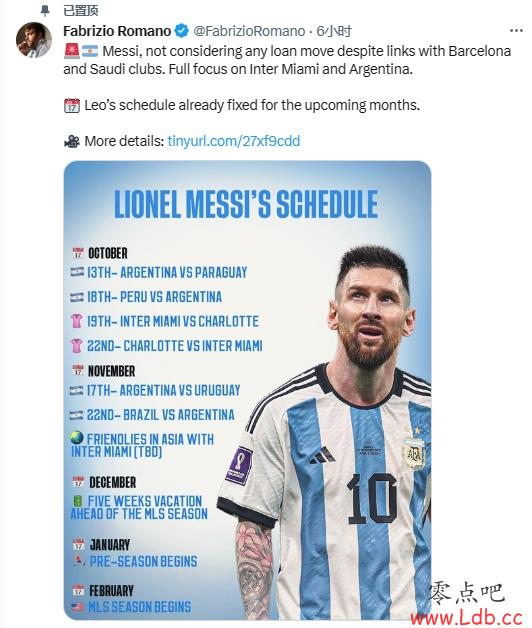 95天假?外租?罗马诺置顶梅西未来日程:世预赛、迈阿密亚洲行