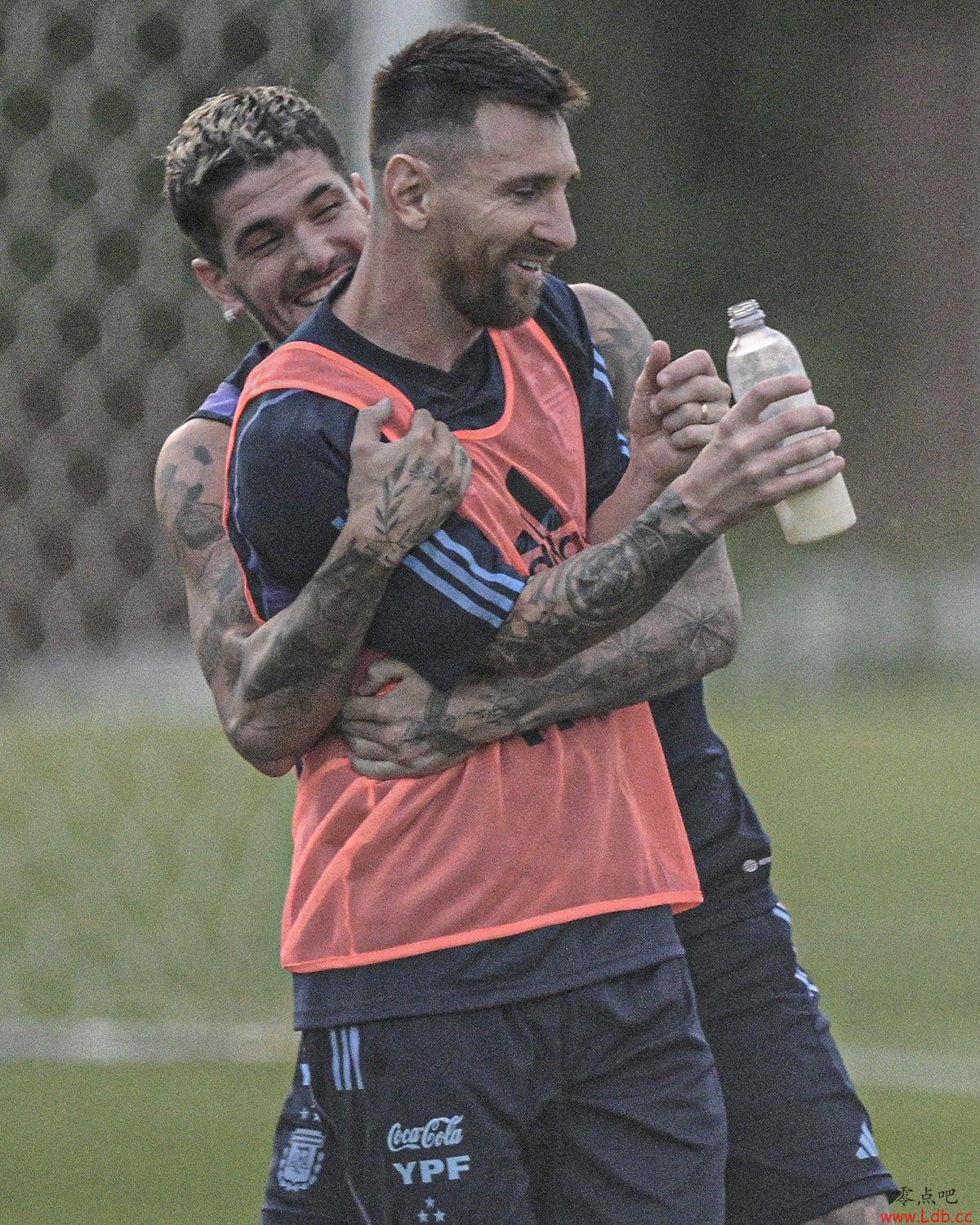 贴身保镖??德保罗训练中紧紧抱住梅西一脸开心????