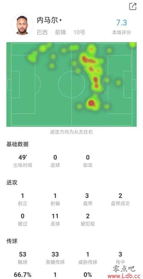 内马尔有1次射正和1次射偏,3次盘带过人2次成功,7次地面对抗成功4次,11次丢失球权,犯规2次,被犯规2次,SofaScore为内马尔上半场的表现打出7.3分评价。