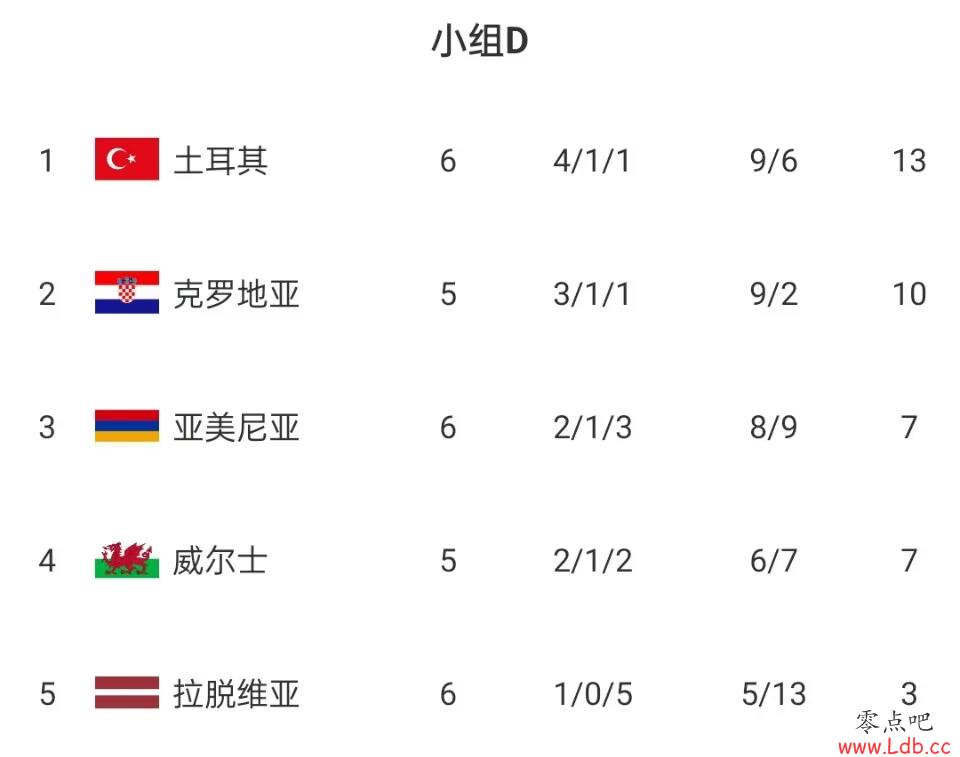 此轮过后,土耳其暂居小组第一,克罗地亚排名小组第二。