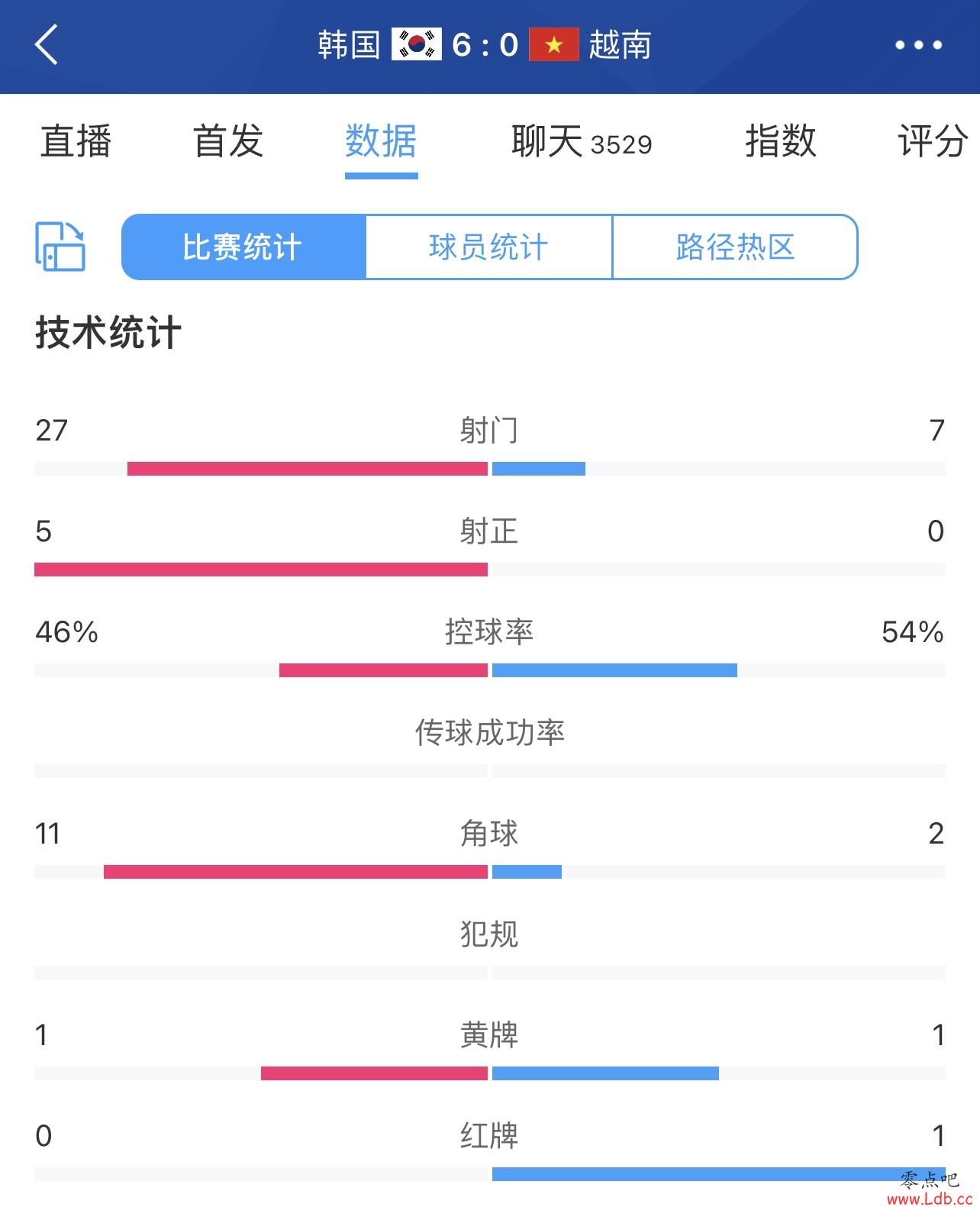 惨败但控球??韩国6-0越南数据:控球46%-54%,射门27-7,角球11-2