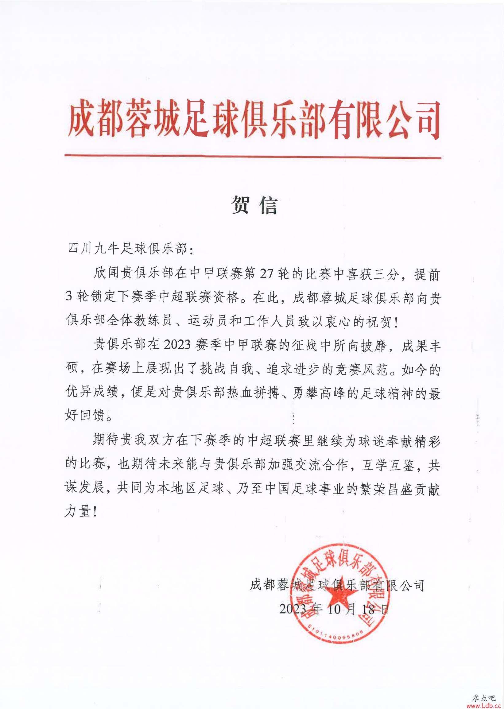 贺信|诚挚祝贺四川九牛足球俱乐部冲超成功!期待明年中超相会! ???