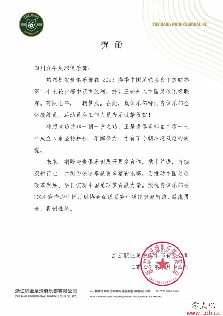 零点吧足球10月19日讯 今天,浙江队官方向四川九牛发去贺函,祝贺对方冲超成功。