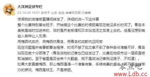 零点吧足球10月20日讯 今天,博主“大洋洲足球专栏”在社媒发文称,迈阿密中国行青岛站没有了。