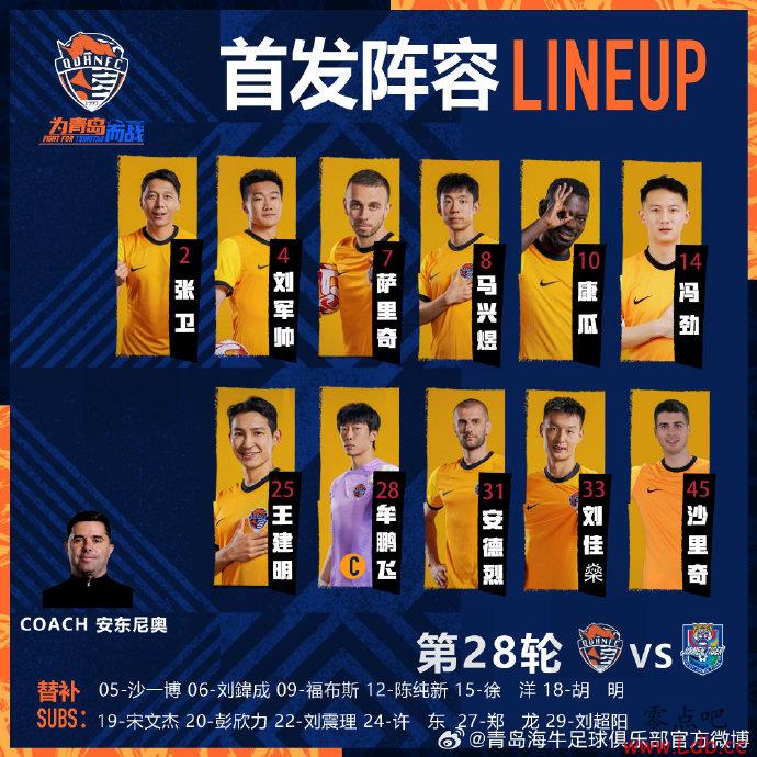 青岛海牛首发:28-牟鹏飞、2-张卫、4-刘军帅、45-沙里奇、25-王建明、31-安德烈耶维奇、33-刘佳燊、7-萨里奇、8-马兴煜、10-康瓜、14-冯劲