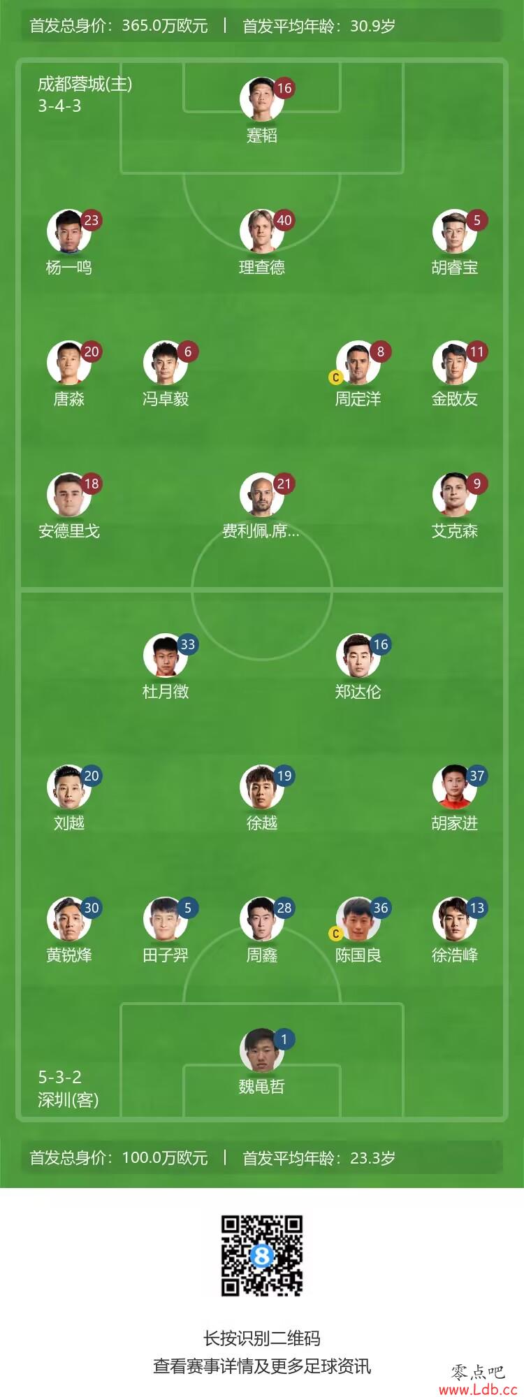 零点吧足球10月23日讯 北京时间19点35分,中超第28轮,成都蓉城vs深圳,赛前双方首发公布。