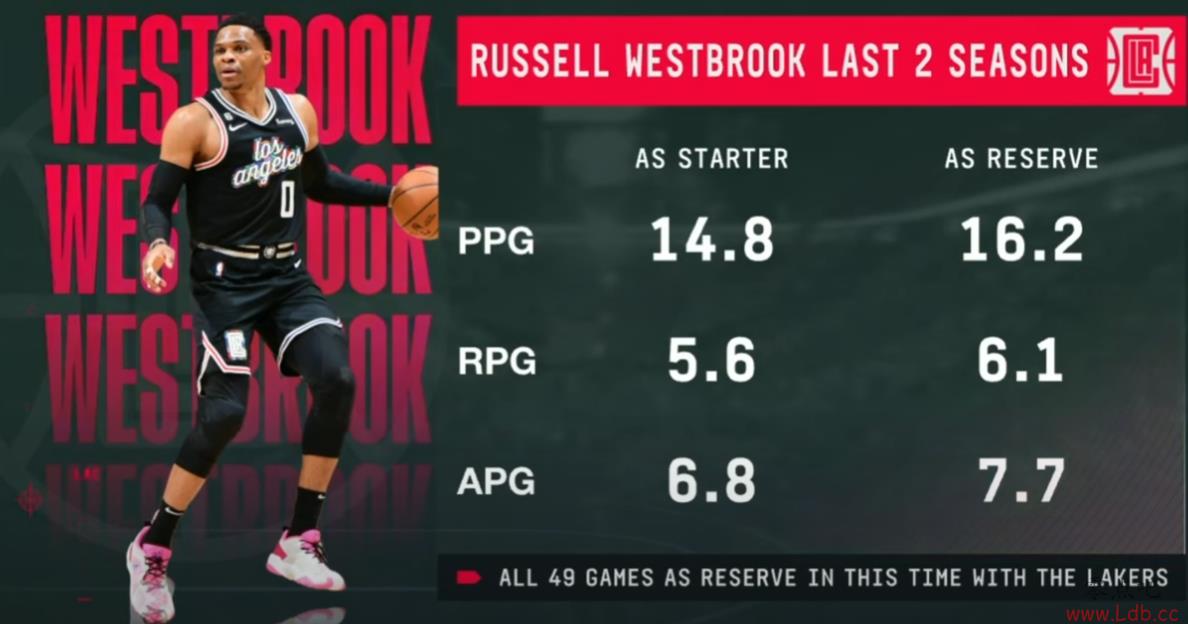 近两个赛季,威少首发时场均14.8分5.6篮板6.8助攻;替补时场均16.2分6.1篮板7.7助攻。