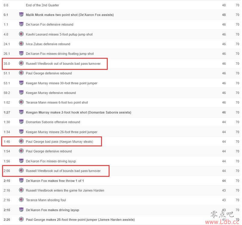 国王中场前2分半怒轰7-0 威少&乔治联手三个失误