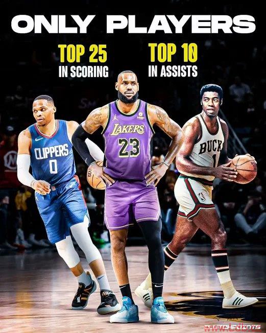 零点吧1月4日讯 据美媒ClutchPoints统计,NBA历史同时排名得分榜前25&助攻榜前10的球员仅有三位,分别是詹姆斯、威少和奥斯卡-罗伯特森。