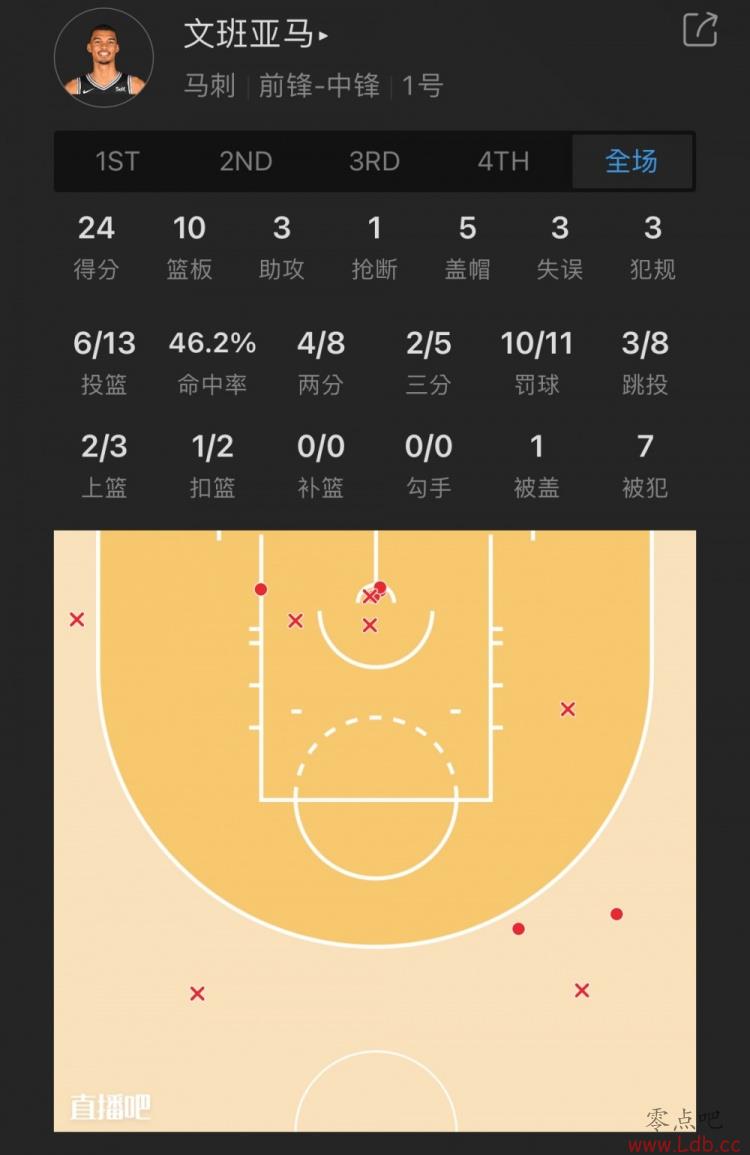 马刺状元秀 维克托-文班亚马 出战24.6分钟
